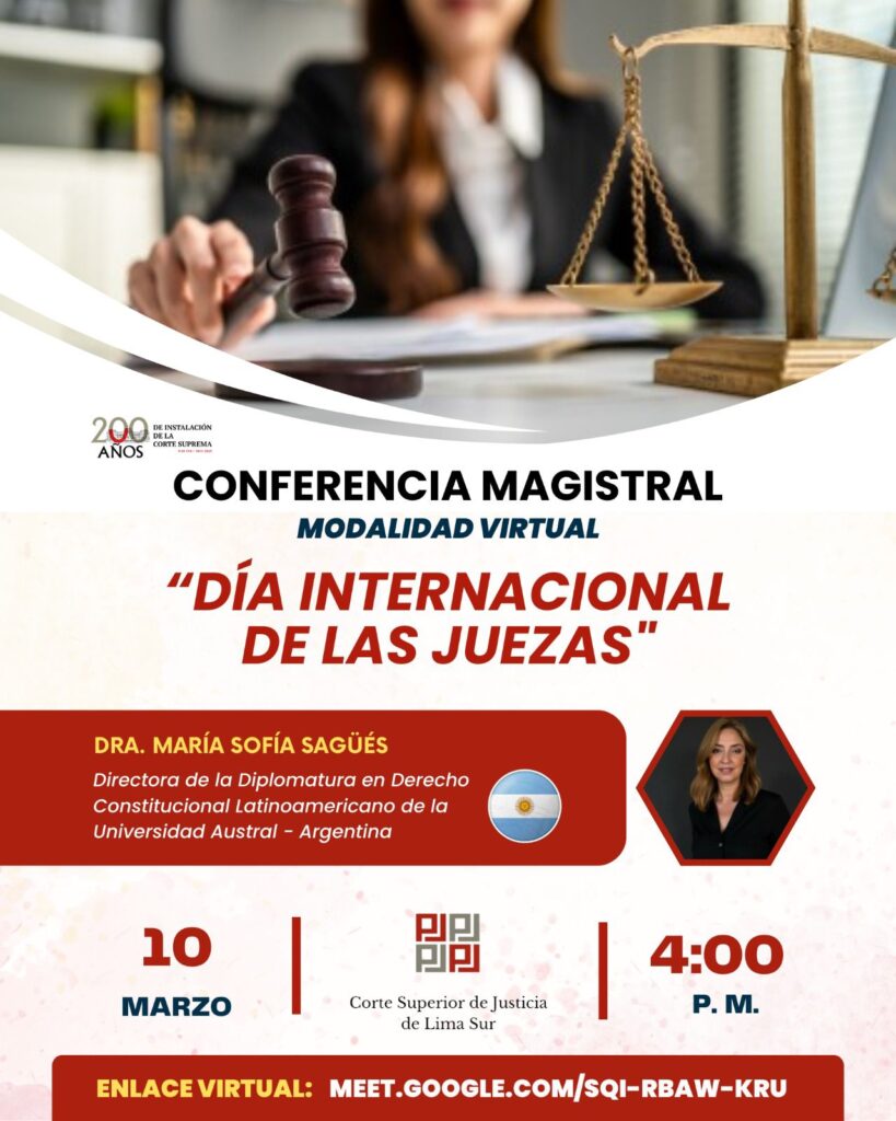 La Asociación de Mujeres Jueces de Argentina (AMJA) declaró de interés institucional la Conferencia Magistral “Día Internacional de las Juezas”, realizada el 10 de marzo en modalidad virtual y organizada por la Corte Superior de Justicia de Lima Sur.