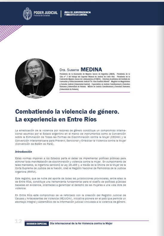 🎓💜La presidenta de AMJA, Dra. Susana Medina, publicó un nuevo artículo en el que analiza en profundidad los avances, desafíos y herramientas institucionales clave para combatir la violencia de género , tomando como referencia la experiencia de la provincia de Entre Ríos.