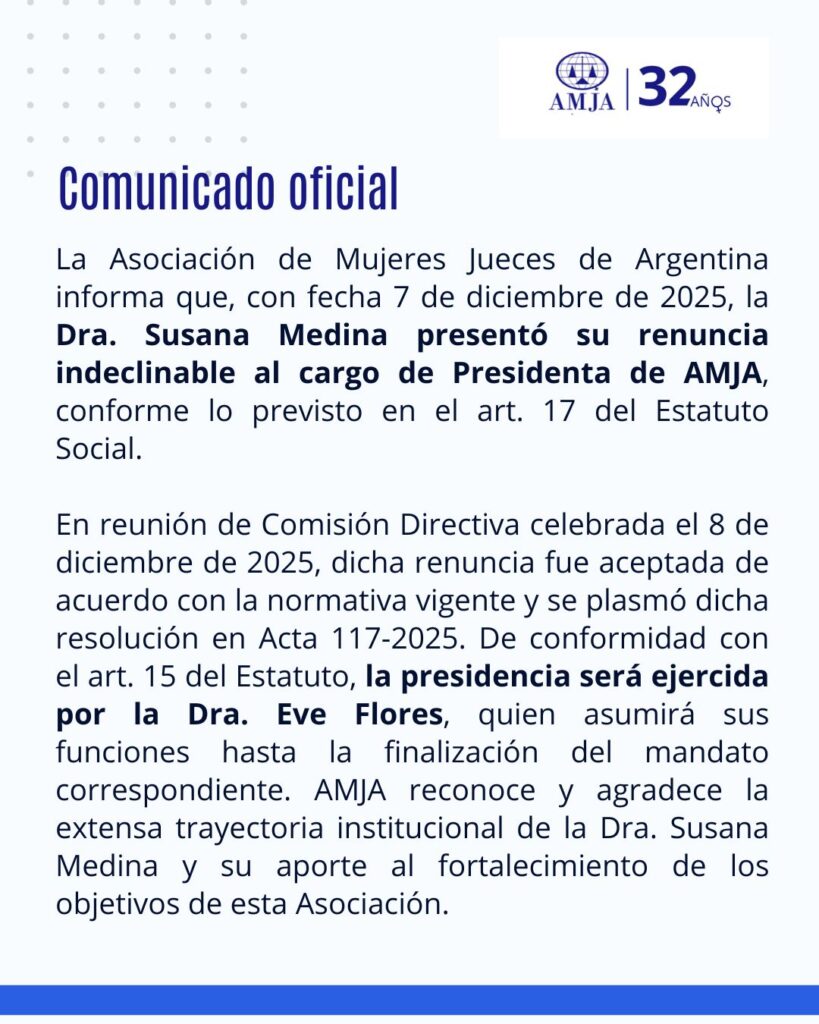 Comunicado oficial. La Dra. Susana Medina presentó su renuncia indeclinable al cargo de presidenta de AMJAPor Cecilia Bignone / 10 diciembre, 2025